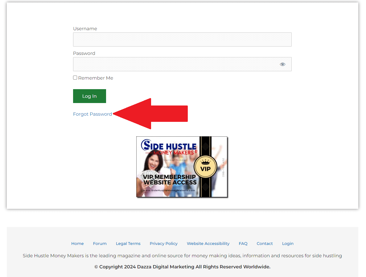 Go to https://sidehustlemoneymakers.com/login and use the link "Forgot Password" function as shown below: